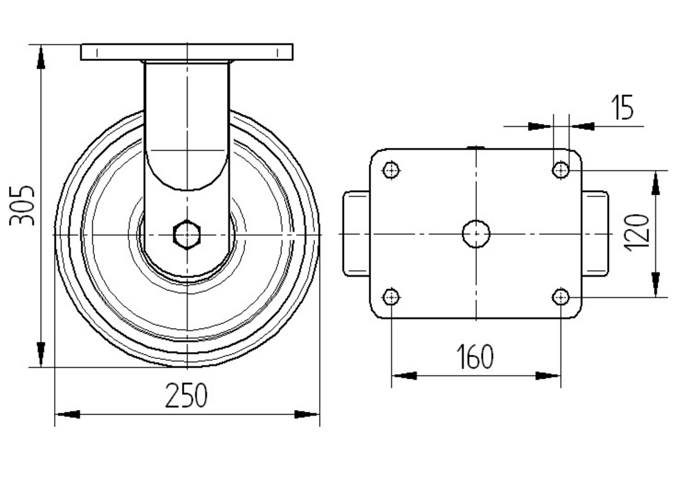 La rueda fija Kappa está equipada con una placa rectangular como sistema de fijación, proporcionando una instalación segura y estable. La carcasa está fabricada en hierro fundido, o hierro forjado, pesado, garantizando una construcción robusta y duradera para aplicaciones industriales exigentes. La rueda presenta un cuerpo de hierro fundido con una banda de rodadura de poliuretano fundido, incorporando rodamiento de bolas de precisión para un funcionamiento suave y fiable. El diámetro de la rueda es de 250 mm, mientras que la altura total del conjunto alcanza los 305 mm. En cuanto a las especificaciones de carga, ofrece una capacidad dinámica de 2040 kg a 4 km/h y 1700 kg a 6 km/h, con una capacidad de carga estática máxima de 4080 kg, siendo ideal para aplicaciones de transporte pesado en entornos industriales.