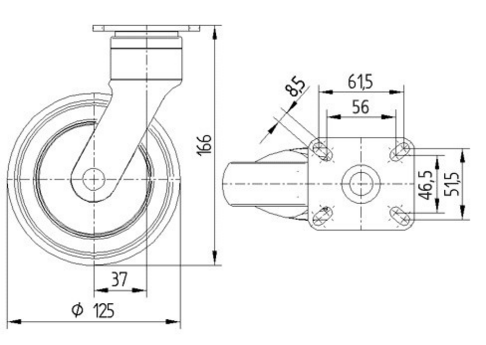La rueda giratoria rueda ICS está equipada con una placa rectangular como sistema de fijación, proporcionando una instalación segura y estable. La carcasa está fabricada en poliamida resistente e incorpora un vástago giratorio espiga que garantiza un movimiento de rotación suave y duradero. La rueda presenta un cuerpo de polipropileno con banda de rodadura de goma termoplástica, montada sobre rodamiento de bolas de precisión para un funcionamiento óptimo, con un diámetro de 125 mm. Las dimensiones generales incluyen una altura total de 166 mm. La capacidad de carga dinámica alcanza los 100 kg a una velocidad de 3 km/h, mientras que la carga estática soporta hasta 200 kg. Esta rueda está especialmente diseñada para aplicaciones en camas de cuidados, ofreciendo movilidad confiable en entornos sanitarios.