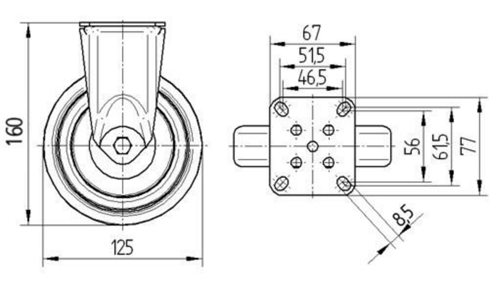 La roulette fixe Agila est équipée d'une platine rectangulaire et d'un boîtier en tôle d'acier moyenne assurant une robustesse optimale. La roue de 125 mm de diamètre présente un corps en polyamide conducteur d'électricité et une bande de roulement en polyuréthane injecté conducteur d'électricité, montée sur roulement à billes de précision pour un fonctionnement fluide et durable. Avec une hauteur totale de 160 mm, cette roulette offre une capacité de charge dynamique de 100 kg à une vitesse de 3 km/h et une charge statique maximale de 200 kg. Elle est particulièrement adaptée aux lits de soins, chariots de restauration et systèmes de distribution de repas, environnements hospitaliers, maisons de retraite et de repos, chariots de nettoyage professionnels ainsi qu'au mobilier et présentoirs de magasin.