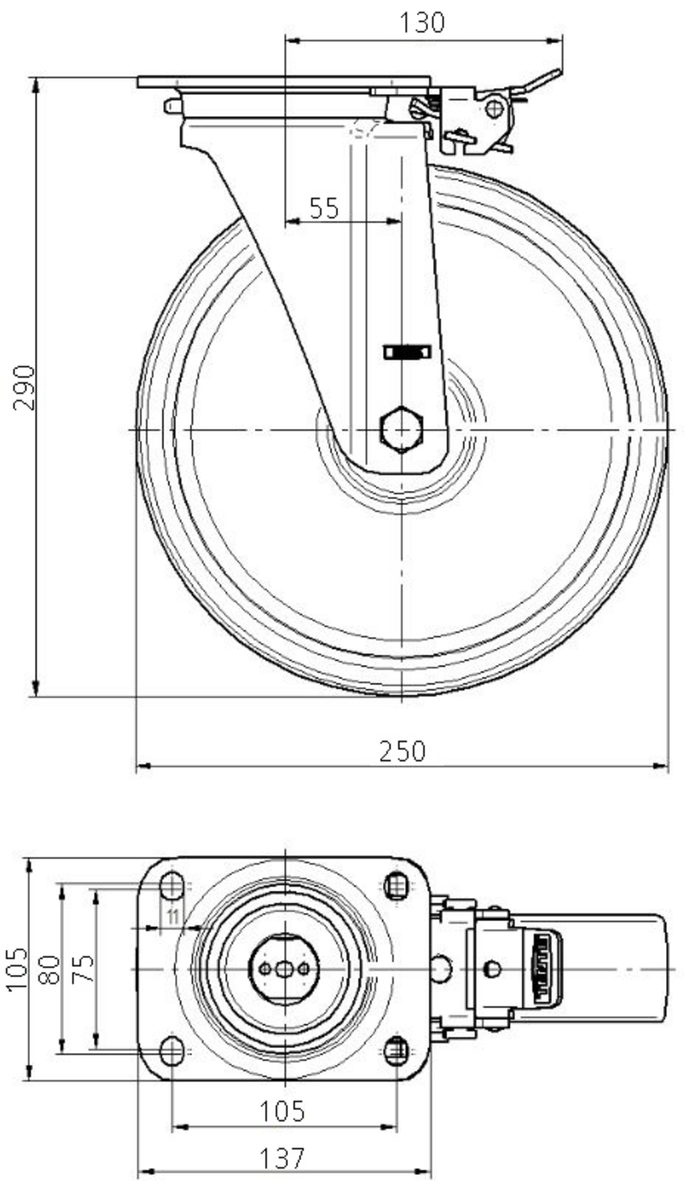 La roulette pivotante à blocage directionnel Zeta est équipée d'une platine rectangulaire et d'un boîtier en tôle d'acier forte charge avec roulement pivotant à double rangée de billes, renforcée ou inoxydable. La roue de 250 mm de diamètre est constituée d'un corps en polyamide forte charge avec une bande de roulement identique au corps de roue et un moyeu lisse. La hauteur hors tout de l'ensemble atteint 290 mm. Cette roulette offre une capacité de charge dynamique de 800 kg à 4 km/h et 640 kg à 6 km/h, ainsi qu'une charge statique maximale de 1600 kg. Elle est particulièrement adaptée aux applications dans l'industrie aérospatiale et équipements aéroportuaires, chez les constructeurs automobiles OEM, pour les chariots de production et de plateforme, ainsi que pour les équipements de transport.