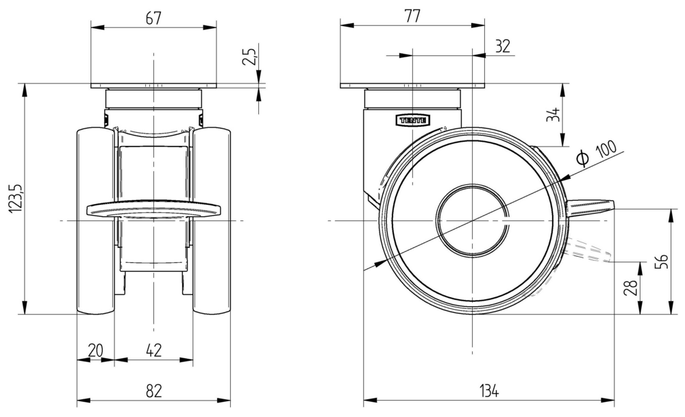 La ruota girevole con blocco direzionale Linea è dotata di placca rettangolare per il fissaggio e presenta un alloggiamento realizzato in poliammide con cuscinetti a sfere di precisione per garantire una rotazione fluida e duratura. La ruota è caratterizzata da un corpo in poliammide e battistrada in poliuretano iniettato, equipaggiata con cuscinetti a sfere di precisione per prestazioni ottimali, con diametro di 100 mm. L'altezza complessiva del componente è di 124 mm. Le specifiche di carico prevedono una capacità dinamica di 120 kg alla velocità di 3 km/h e una capacità statica di 240 kg, rendendola ideale per applicazioni ospedaliere, carrelli medicali, arredi per ufficio, dispositivi diagnostici e sistemi di movimentazione professionale che richiedono elevata affidabilità e controllo direzionale.