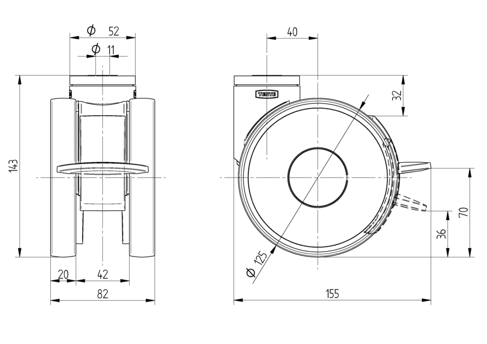 方向ロック付き旋回キャスター 125 mm