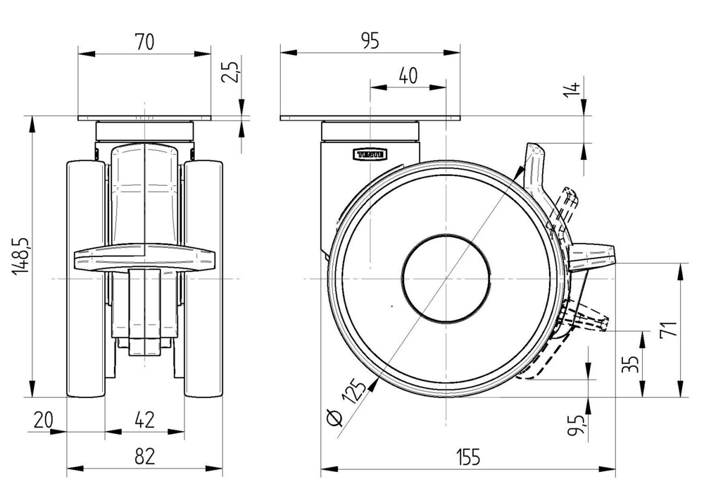 The Linea swivel castor with combined lock features a rectangular plate fitting with us-bolt hole spacing. The housing is made of polyamide with a precision ball bearing swivel bearing. The wheel body material is polyamide with a polyurethane injected tread. The wheel has a precision ball bearing. The Linea swivel castor has a wheel diameter of 125 mm and an overall height of 148.5 mm. It has a load capacity of 130 kg at 3 km/h and a static load capacity of 260 kg.
