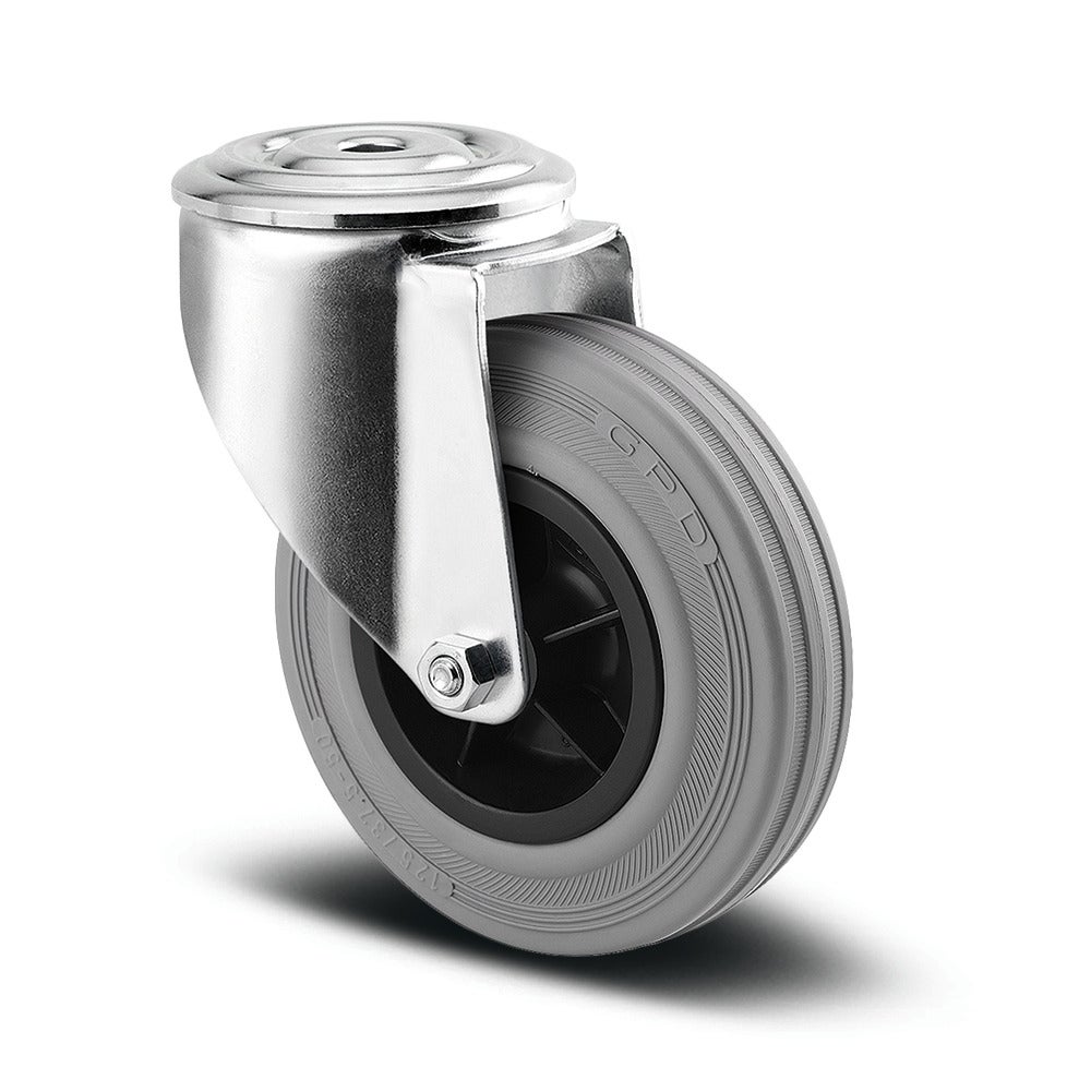 Het Alpha wiel is ontworpen met een boutgat bevestiging voor veelzijdige toepassingen. De behuizing is vervaardigd uit zwaar staalplaat en uitgerust met twee balraces als zwenklager voor soepele draaibeweging. Het wiel bestaat uit een polypropyleen wiellichaam met een massief rubber, niet-markerend loopvlak en is voorzien van een glijlager voor betrouwbare prestaties. Met een wieldiameter van 125 mm en een totale hoogte van 155 mm biedt dit wiel uitstekende manoeuvreerbaarheid. De dynamische draagkracht bedraagt 100 kg bij een snelheid van 4 km/h, terwijl de statische draagkracht 200 kg is. Dit wiel is geschikt voor diverse toepassingen zoals automotive OEM, cateringwagens, containerbouw, elektronische systemen, brandbestrijdingstechnologie, machinebouw, postlogistieke systemen, productie- en platformwagens, rolkooien, gereedschapskasten, transportapparatuur, afvalverwerkingsapparatuur en werkbanken.