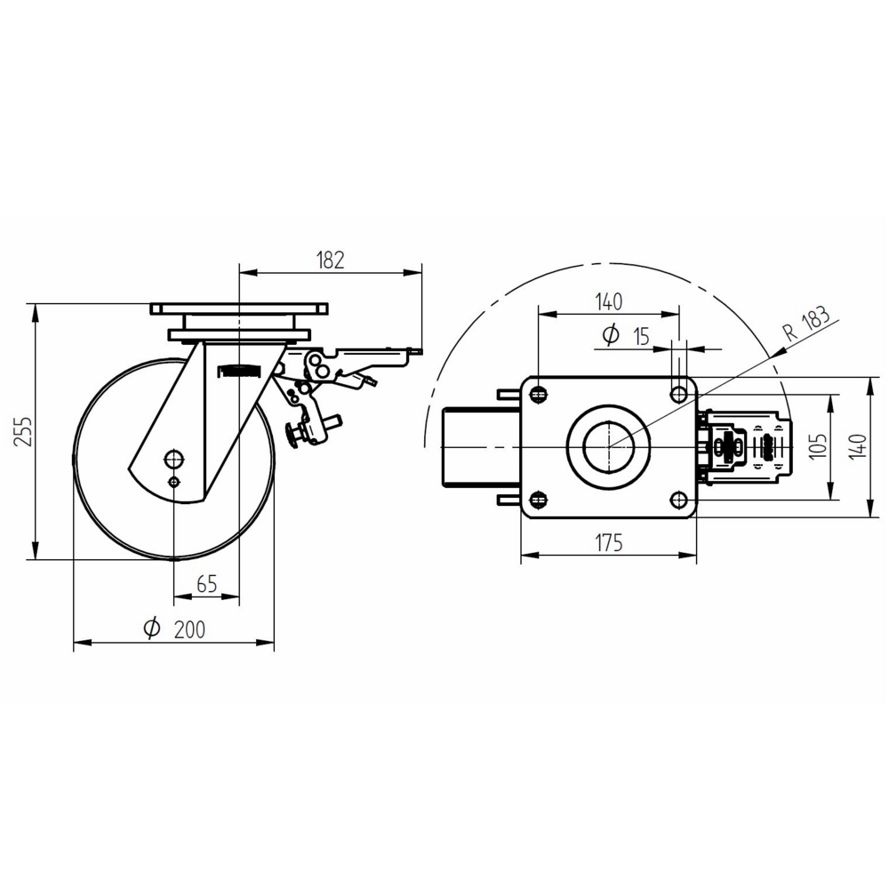 De Kappa load is een wiel met totale vergrendeling aan de voorkant van het wiel, uitgerust met een rechthoekige plaat bevestiging. De behuizing is vervaardigd uit gietijzer of ijzer gesmeed in zware uitvoering en beschikt over een rollager zwenklager voor optimale bewegingsvrijheid. Het wiel heeft een gietijzeren wiellichaam met een gegoten polyurethaan loopvlak en is voorzien van precisie kogellagers voor soepele werking. Met een wieldiameter van 200 mm en een totale hoogte van 255 mm biedt dit wiel uitstekende prestaties. De dynamische draagkracht bedraagt 1680 kg bij 4 km/h en 1400 kg bij 6 km/h, terwijl de statische draagkracht 3360 kg bereikt. Dit wiel is speciaal ontwikkeld voor veeleisende toepassingen zoals lucht- en ruimtevaartindustrie, luchthavenapparatuur, AMR-systemen, automotive OEM, keramiek- en glasfabrikanten, productie- en platformwagens, en zware AGV-systemen.
