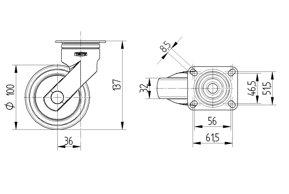O rodízio giratório Levina é equipado com uma placa de fixação retangular e apresenta uma estrutura robusta adequada para aplica...