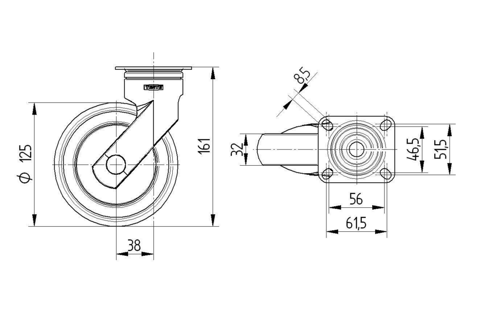 O rodízio giratório Levina é equipado com uma placa de fixação retangular e apresenta uma estrutura robusta para aplicações técn...
