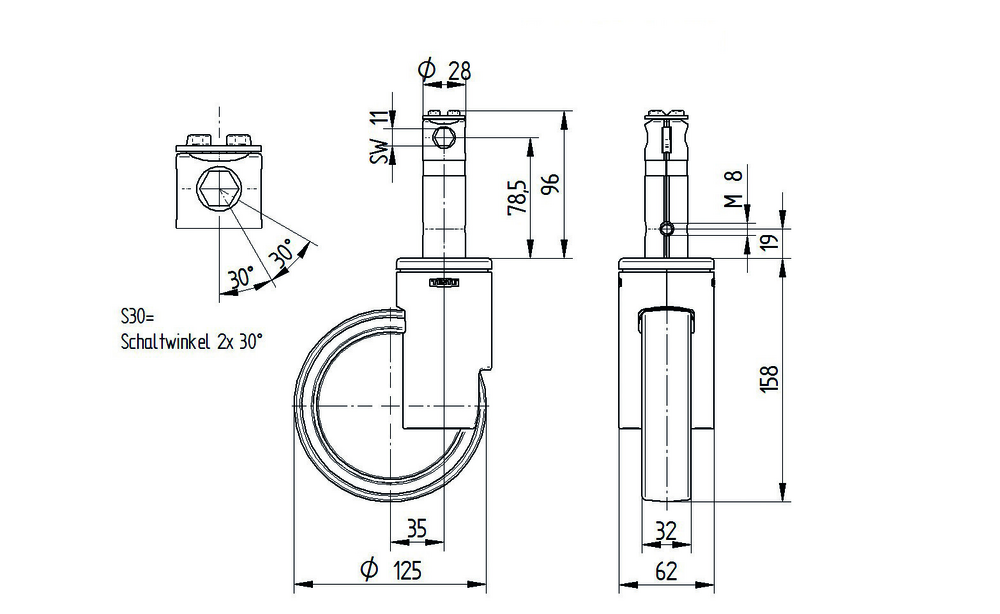 Rodízio giratório com travão central e total 125 mm
