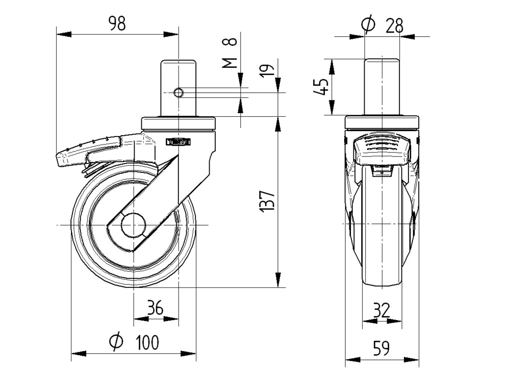 Rodízio giratório com travão direcional 100 mm