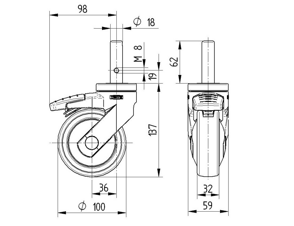 O rodízio giratório com travão total Levina apresenta uma espiga sólida, redonda como sistema de fixação. O alojamento é fabricado em poliamida e incorpora um rolamento giratório de duas filas de esferas para garantir movimento suave e durabilidade. A roda possui corpo em poliamida eletro-condutivo com banda de rodagem em poliuretano injetado eletro-condutivo, equipada com rolamento de esferas de precisão para funcionamento silencioso e eficiente. Com diâmetro de roda de 100 mm e altura total de 137 mm, este rodízio oferece capacidade de carga dinâmica de 100 kg a velocidade de 3 km/h e capacidade de carga estática de 200 kg, sendo ideal para aplicações em equipamentos médicos, carrinhos hospitalares, mobiliário comercial e sistemas de transporte que requerem propriedades antiestáticas.