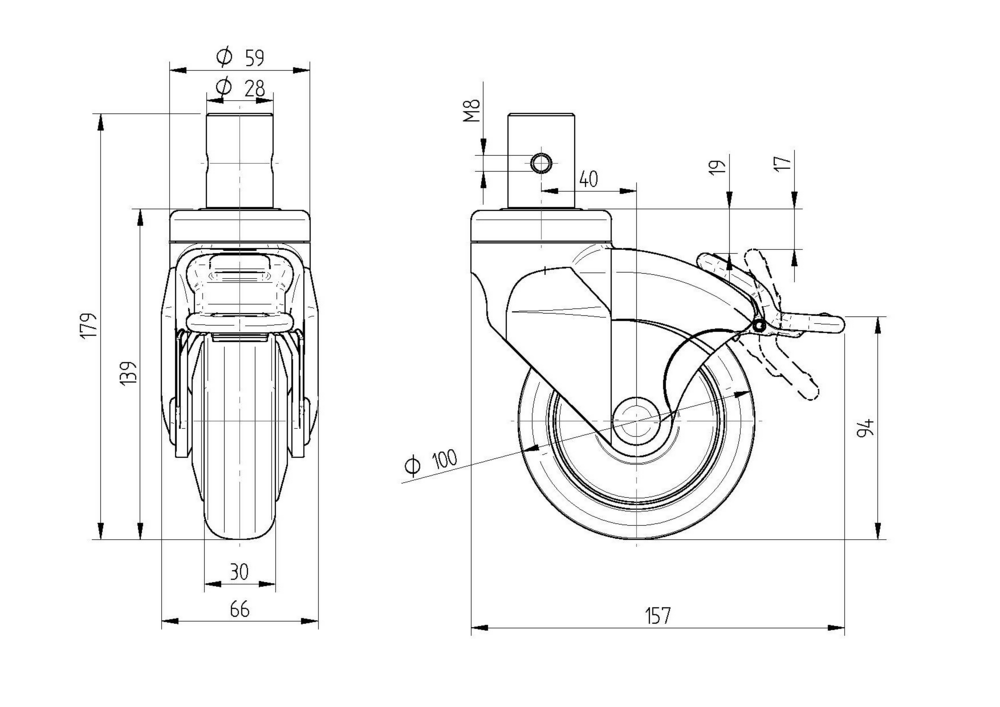 Rodízio giratório com travão direcional 100 mm