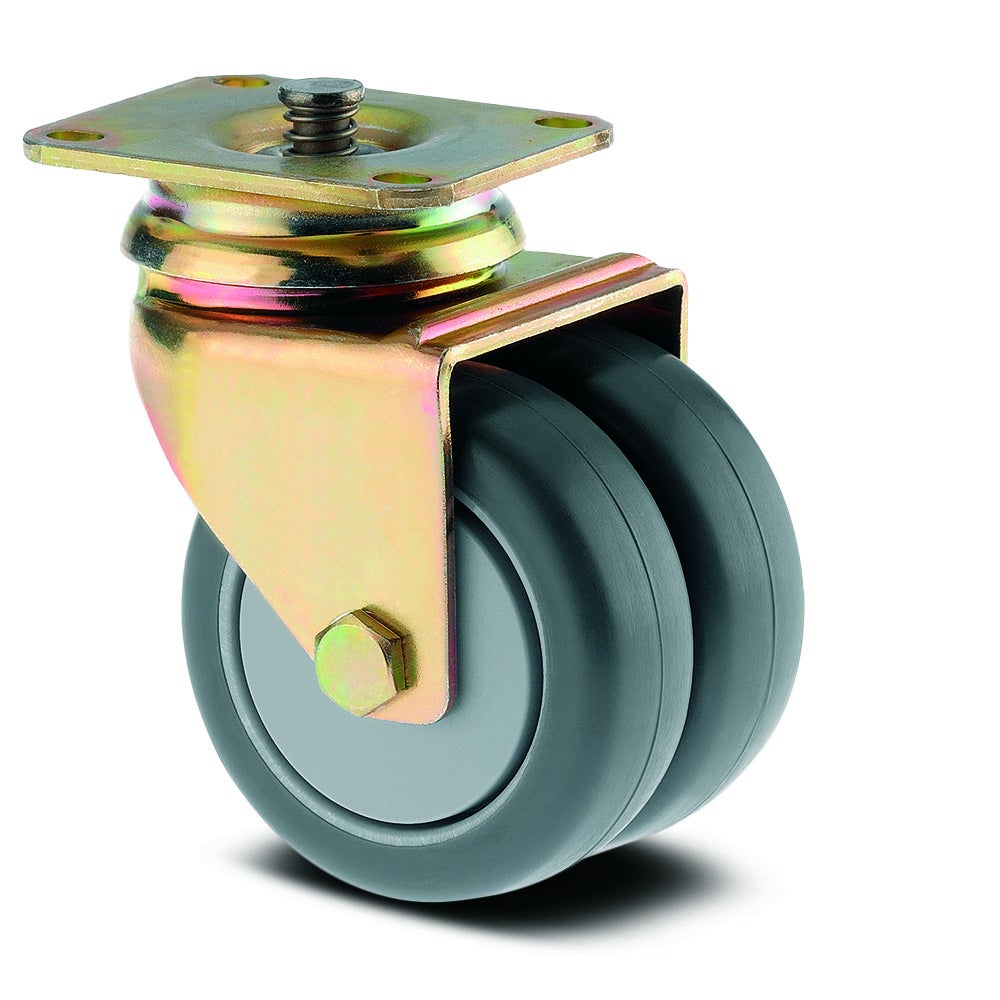 Поворотное колесная опора с центральным общий тормоз Agila twin оснащена прямоугольной пластиной с тормозными элементами для надежного крепления. Корпус изготовлен из стального листа среднего качества и оборудован поворотным механизмом с двумя гонками с мячом для плавного вращения. Колесо диаметром 75 мм имеет корпус из полиамида и протектор из инжекционного полиуретана, установленное на кронусном шарикоподшипнике из нержавеющей стали. Общая высота конструкции составляет 103 мм. Динамическая грузоподъемность достигает 100 кг при скорости движения 3 км/ч, статическая нагрузка - 200 кг. Опора предназначена для использования в медицинских кроватях, тележках для кейтеринга и системах доставки питания, бортовых тележках, торговой мебели и витринах.