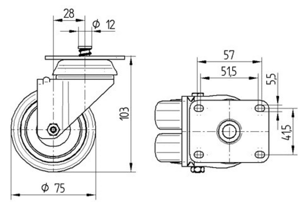 Поворотное Колесная опора с центральным Общий тормоз 75 mm