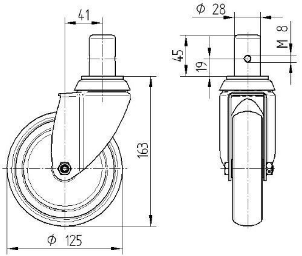 Поворотная колесная опора Agila оснащена цельным стержнем круглым для надежного крепления. Корпус изготовлен из стального листа среднего качества с поворотным механизмом на двух гонках с мячом, обеспечивающим плавное вращение на 360°. Колесо диаметром 125 мм имеет корпус из полипропилена с протектором из термопластичной резины и подшипником скольжения для бесшумной работы. Общая высота конструкции составляет 163 мм. Динамическая грузоподъемность достигает 100 кг при скорости движения до 3 км/ч, статическая нагрузка - 200 кг. Опора предназначена для медицинских кроватей, тележек для кейтеринга и систем доставки питания, больниц, домов престарелых и пансионатов, профессиональных тележек для уборки, торговой мебели и витрин.