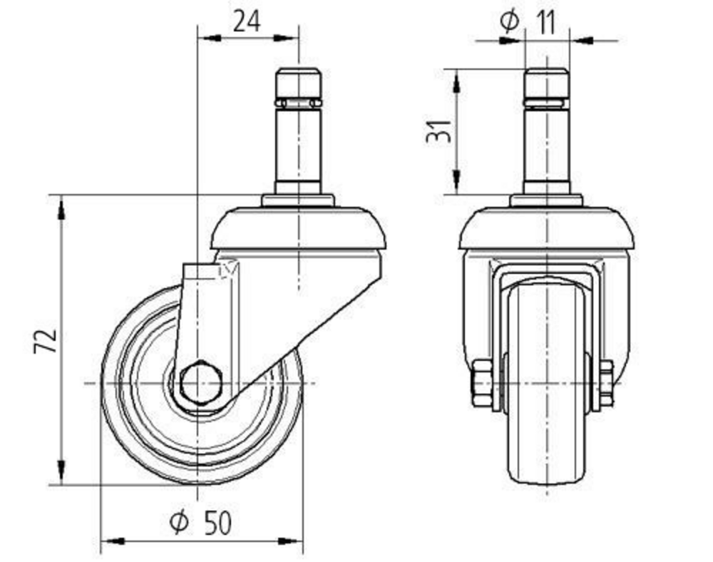 Поворотная колесная опора с тормозом колеса Agila оснащена стержнем с кольцом для захвата, с воротником для надежного крепления. Корпус изготовлен из стального листа среднего качества и оборудован поворотным механизмом с двумя гонками с мячом, обеспечивающим плавное вращение. Колесо диаметром 50 мм имеет основание из листовой стали и протектор из литой резины без следов, установленное на кронусном шарикоподшипнике для долговечной работы. Общая высота конструкции составляет 72 мм. Динамическая грузоподъемность достигает 40 кг при скорости движения 3 км/ч, статическая нагрузка - до 80 кг. Изделие предназначено для медицинских кроватей, тележек для кейтеринга и систем доставки питания, больниц, домов престарелых и пансионатов, профессиональных тележек для уборки, торговой мебели и витрин.