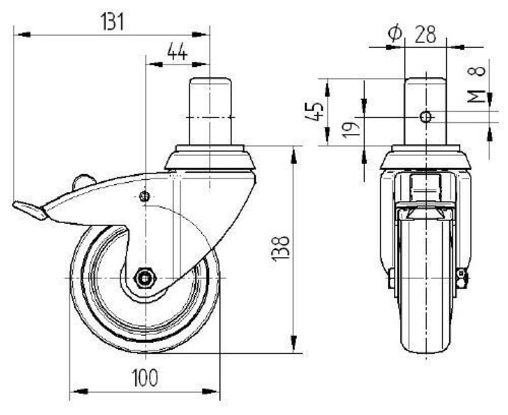 Поворотное колесная опора с общий тормоз Agila оснащена цельным стержнем круглым для надежного крепления. Корпус изготовлен из стального листа среднего качества и оборудован поворотным механизмом с двумя гонками с мячом, обеспечивающим плавное вращение. Колесо диаметром 100 мм имеет корпус из полипропилена с протектором из термопластичной резины и подшипником скольжения для бесшумной работы. Общая высота конструкции составляет 138 мм. Динамическая грузоподъемность достигает 80 кг при скорости движения до 3 км/ч, статическая нагрузка - 160 кг. Изделие предназначено для использования в медицинских кроватях, тележках для кейтеринга и системах доставки питания, больницах, домах престарелых и пансионатах, профессиональных тележках для уборки, торговой мебели и витринах.