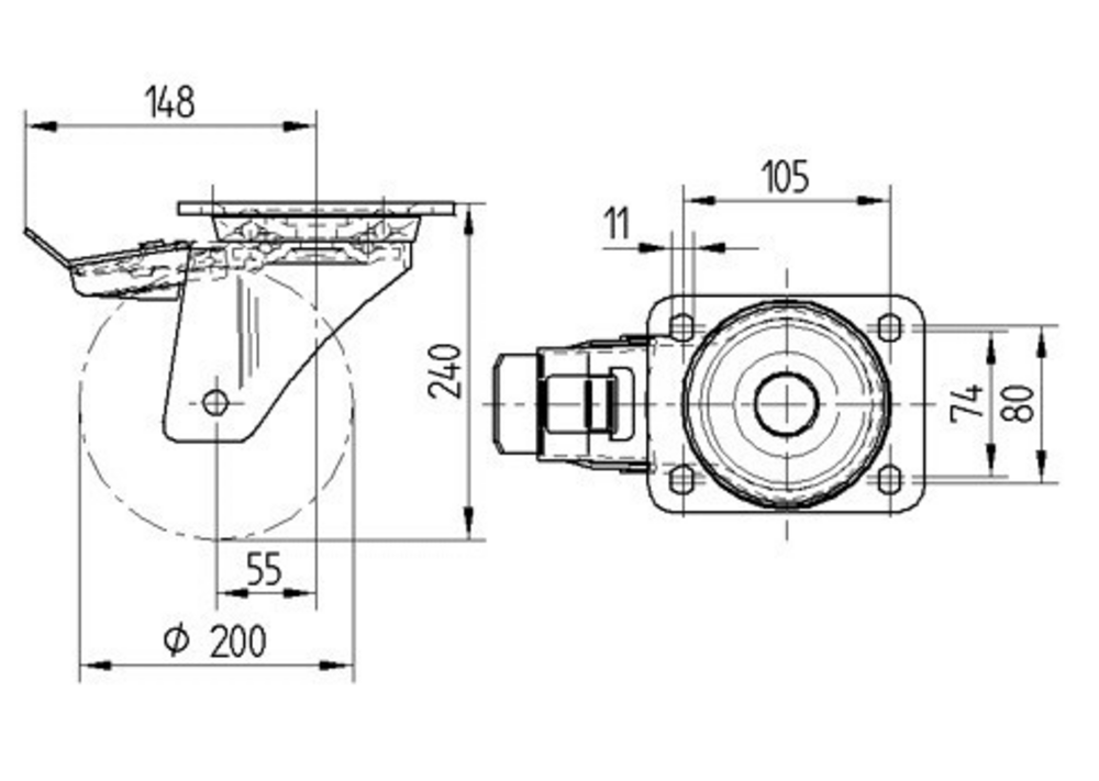 Поворотное Колесная опора с Тормоз направления 200 mm