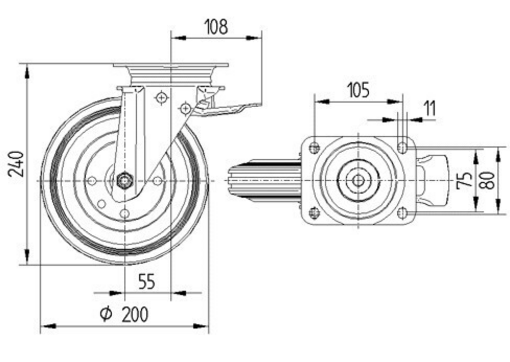 Swivel castor with total lock, head end of castor 200 mm