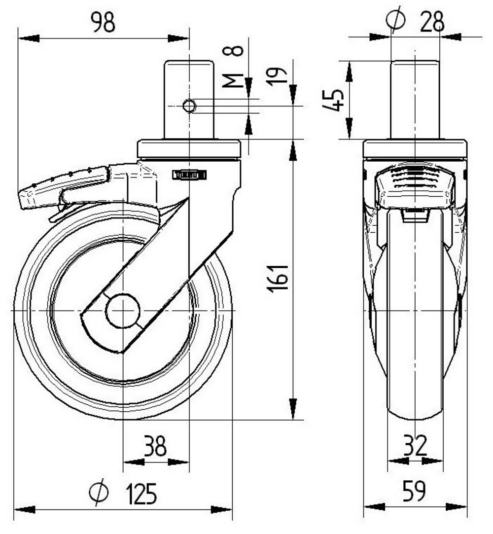Levina带方向锁的旋转脚轮采用实心铆杆圆形连接方式,确保稳固安装。脚轮外壳由高强度聚酰胺材料制成,配备两个钢珠滚道的旋转轴承系统,提供平稳的360度旋转性能和可靠的方向锁定功能。车轮主体同样采用聚酰胺材料制造,胎面为注塑聚氨酯材质,具有优异的耐磨性和静音效果,内置精密滚珠轴承确保轻松滚动。车轮直径为125毫米,脚轮总高度为161毫米。载重能力方面,动载荷为100公斤(行驶速度3公里/小时),静载荷可达200公斤。该脚轮广泛应用于医疗设备如麻醉车、C型臂、CT扫描仪、核磁共振、X光机、护理床、透析车、呼吸机等,同时适用于餐饮手推车、带轮计算机、专业清洁车、购物车、商店家具展示架、工作台、工具柜等多种场合,满足医院、养老院、护理院等专业环境的严格要求。