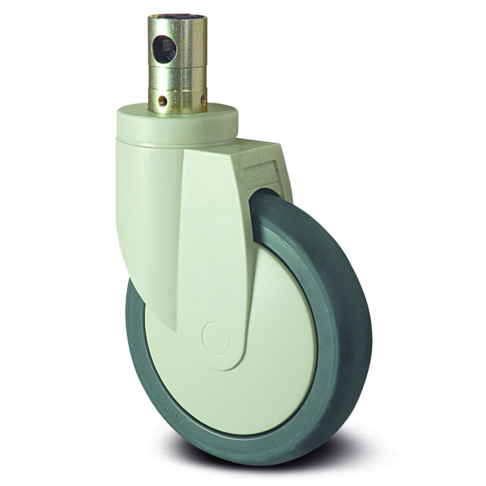 Cover design带中控全锁或方向锁的万向脚轮采用带凸轮孔的闸杆,用于异型杆,短版本的安装方式。外壳采用钢板,中号材质制造,配备两个钢珠滚道的旋转轴承系统,确保平稳的360度旋转运动。车轮轮体由聚酯胺,导电材料制成,胎面采用聚氨酯,注塑,导电材质,提供优异的耐磨性和防静电性能,轮子配置精密滚珠轴承以减少滚动阻力。车轮直径为125毫米,脚轮总高度为163毫米。该脚轮的动态载荷能力为100千克(在3千米每小时的速度下),静态载荷能力可达200千克,适用于需要高承载能力和精确控制的工业应用场合。