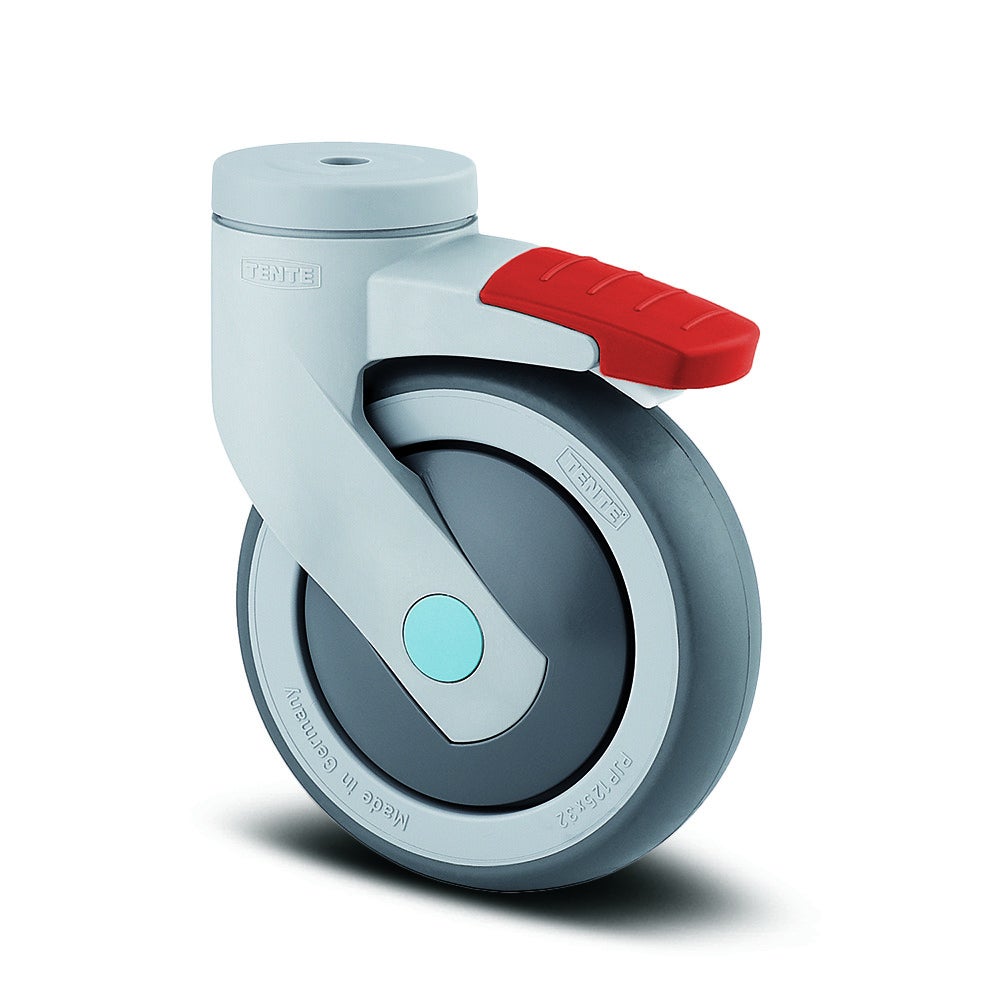 Levina stainless带全锁的旋转脚轮采用螺栓孔安装方式,为医疗和专业应用提供可靠的移动解决方案。脚轮外壳由聚酯胺材料制成,配备两个球座圈,加强的型或不锈钢型旋转轴承,确保平稳的360度旋转性能。车轮直径为125毫米,轮体采用聚丙烯材料,踏面覆盖热塑性橡胶,提供优异的滚动性能和地面保护,轮毂内置精密滚珠轴承,不锈钢材质保证长期使用的耐腐蚀性。脚轮总高度为161毫米,结构紧凑适合各种设备安装。载重能力方面,动载荷为100公斤(运行速度3公里/小时),静载荷可达200公斤。该产品广泛应用于麻醉车、C型臂CT扫描仪核磁共振X光设备、餐饮手推车和送餐系统、带轮计算机、透析车、医院药品车、养老院和护理院护理车、超声设备、呼吸机以及专业清洁车等医疗和专业领域。