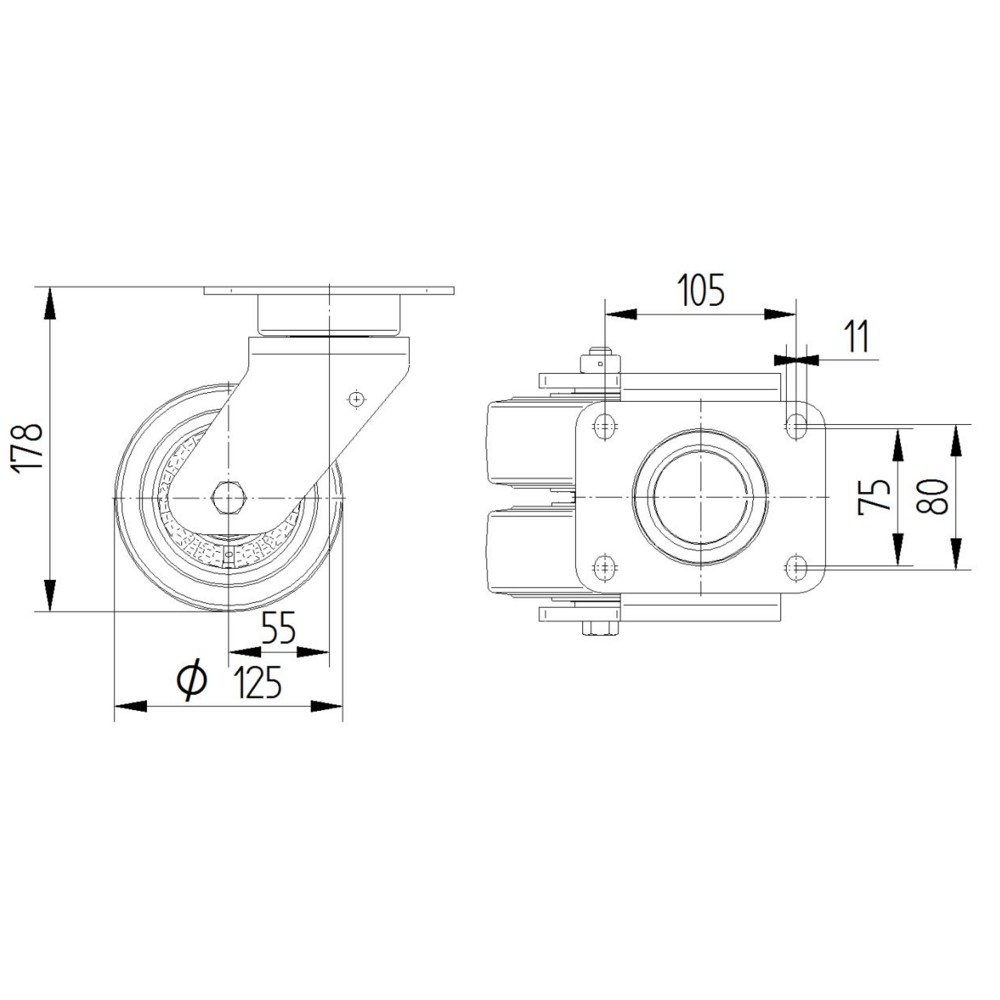 Delta twin万向脚轮采用矩形板安装方式,配备铸铁或锻铁重型轮架,转向系统使用精密滚珠轴承确保灵活操作。车轮主体采用铝制材料,胎面为铸造聚氨酯材质,轮径125毫米,轮轴配置精密滚珠轴承保证平稳运行。脚轮总高度178毫米,结构紧凑适合各种安装环境。动态承载能力在4公里/小时速度下可达750公斤,在6公里/小时速度下为600公斤,静态承载能力高达1500公斤,能够满足重载应用需求。该产品广泛应用于航空航天工业机场设备、汽车OEM制造、生产和平台手推车以及各类运输设备,为工业移动解决方案提供可靠的承载和转向性能。