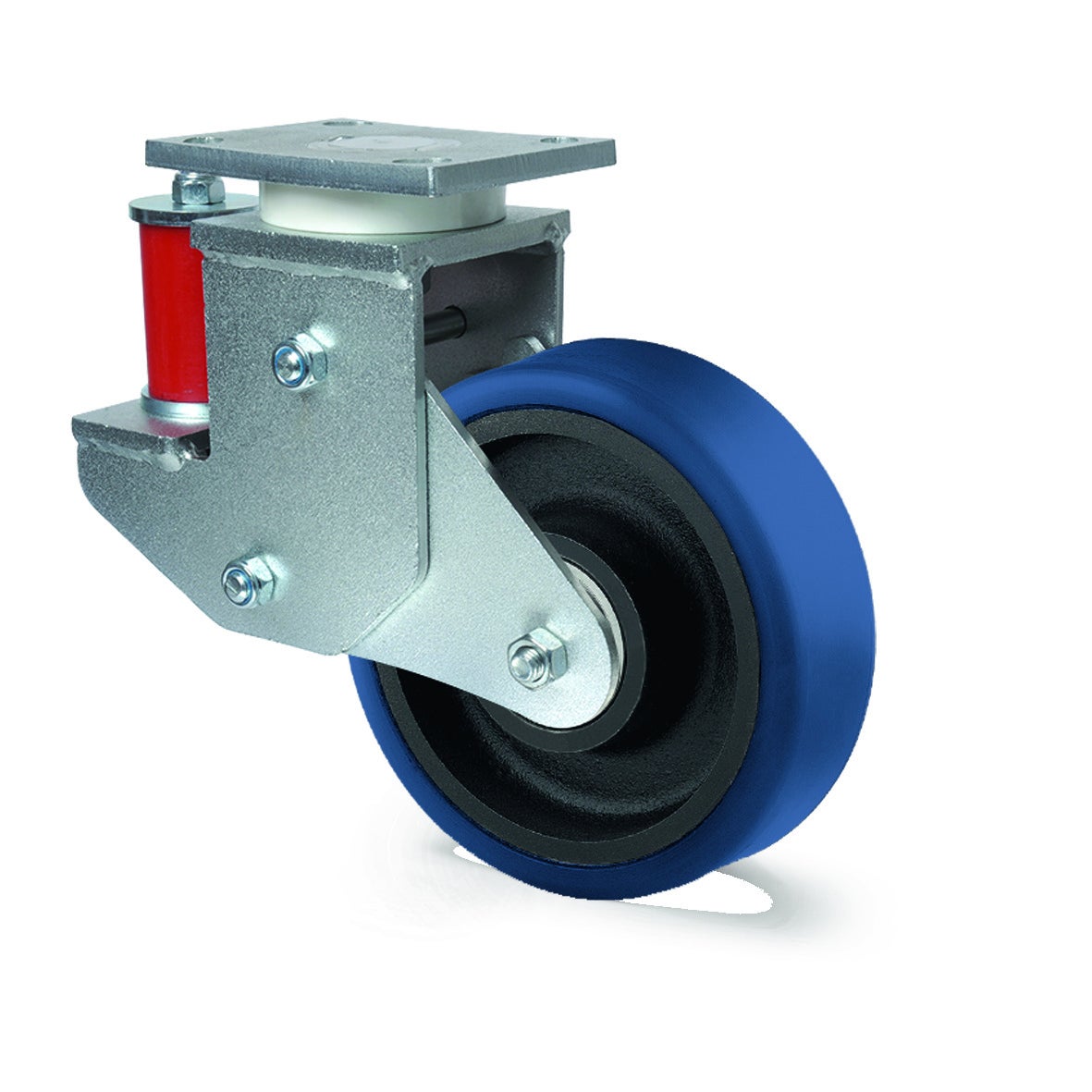 Omikron flex万向脚轮采用矩形板安装方式,具有坚固耐用的结构设计。脚轮外壳采用铸铁或锻铁重型材质制造,配备深槽滚珠推力滚柱轴承的旋转机构,确保平稳的360度转向性能。车轮轮体采用铸铁材质,胎面使用铸造的Ultratech聚氨酯材料,提供优异的耐磨性和减震效果,轮毂内置精密滚珠轴承保证顺畅运转。车轮直径为200毫米,脚轮总高度为272毫米,结构紧凑适用于各种工业环境。该脚轮静态承载能力达1600公斤,动态承载能力在4公里/小时速度下为800公斤,在6公里/小时速度下为600公斤,能够满足重载应用需求。产品特别适用于航空航天工业机场设备和重型AGV系统等高要求的工业应用场景。