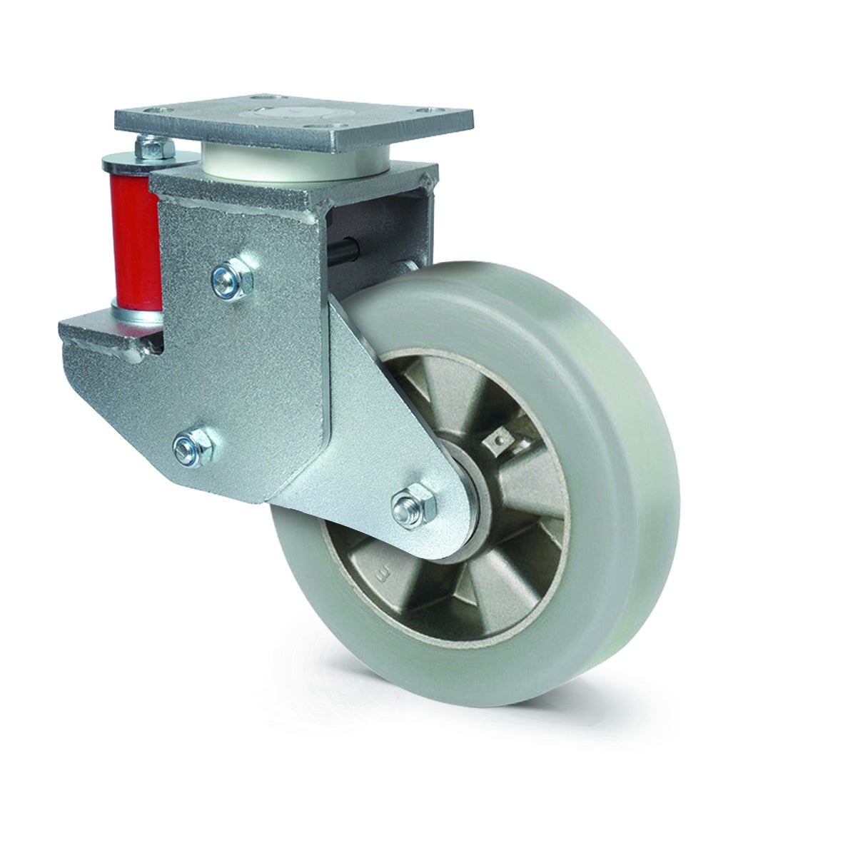 Omikron flex万向脚轮采用矩形板安装方式,配备铸铁或锻铁重型轮架,使用深槽滚珠推力滚柱轴承作为旋转轴承系统,确保卓越的转向性能和耐久性。脚轮轮体采用铝制材料制造,胎面为聚氨酯铸造材料,具备优异的耐磨性和减震性能,轮子配置精密滚珠轴承以保证平稳运行。轮子直径为200毫米,脚轮总高度为272毫米,结构紧凑适用于各种工业环境。该脚轮静态承载能力达1280公斤,动态承载能力在4公里每小时速度下为640公斤,在6公里每小时速度下为500公斤,能够满足重载应用需求。产品特别适用于航空航天工业机场设备和重型AGV系统等高要求工业场景,为用户提供可靠的移动解决方案。