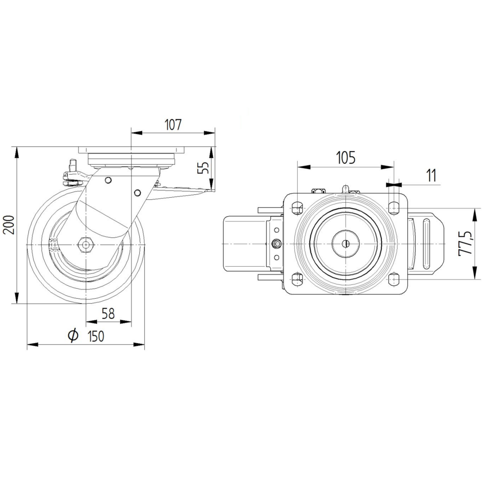 Kappa带全锁的旋转脚轮,脚轮头端采用矩形板配件设计,确保稳固的安装连接。脚轮外壳采用铸铁或锻铁重型材质制造,配备两个球座圈,加强的型或不锈钢型旋转轴承系统,提供卓越的承载能力和耐久性。车轮轮体采用聚酯胺重型材料,胎面材质与轮子体相同,确保一致的性能表现,内置精密滚珠轴承保证平稳运转,轮径为150毫米。脚轮总高度为200毫米,结构紧凑适用于各种工业环境。动态载荷能力在4公里/小时速度下可承载960公斤,在6公里/小时速度下可承载800公斤,静态载荷能力高达1600公斤。该产品广泛应用于航空航天工业机场设备、AMR系统、汽车OEM、陶瓷和玻璃制造商、生产和平台手推车以及重型AGV系统等领域。