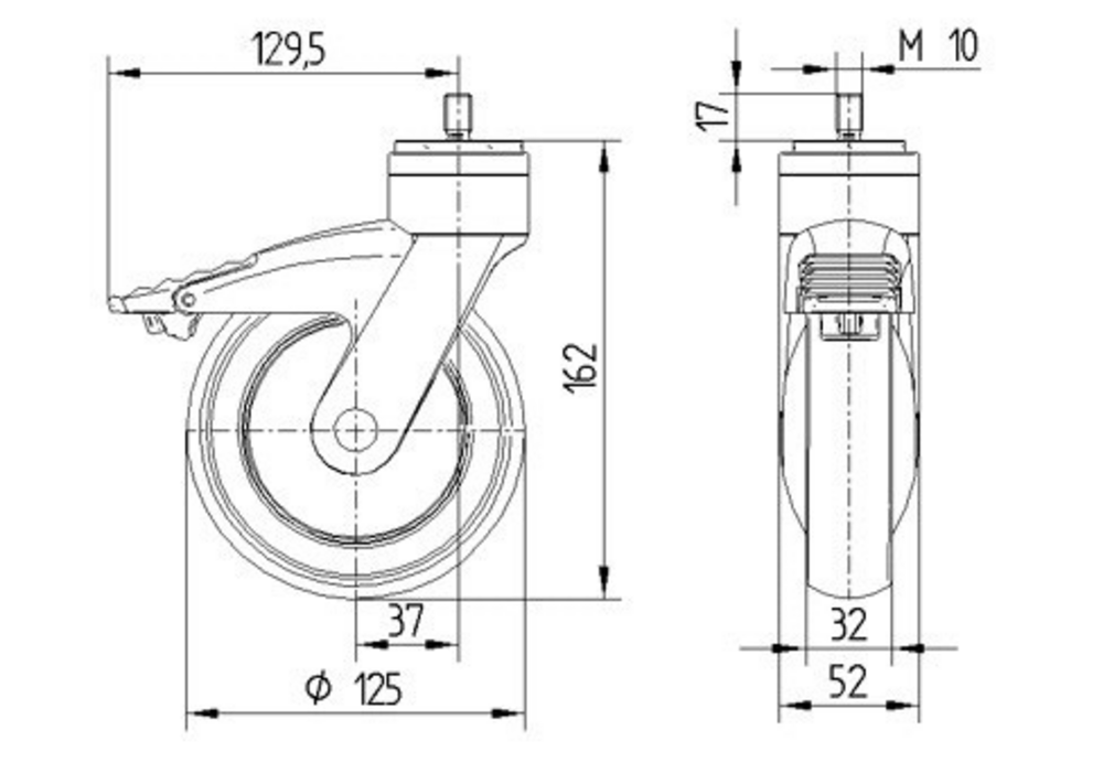 ICS带全锁的旋转脚轮采用六角颈螺纹铆杆,上衣配置,为护理床等应用提供可靠的移动解决方案。脚轮外壳采用聚酰胺材料制造,配备铆杆旋转轴承系统,确保平稳的旋转性能和持久的使用寿命。车轮本体采用聚丙烯材料构造,胎面覆盖热塑性橡胶,提供优异的滚动性能和地面保护,轮毂内置精密滚珠轴承,保证运转的顺畅性和静音效果。脚轮车轮直径为125毫米,整体高度为162毫米,结构紧凑适用于各种安装环境。该脚轮动态承载能力为100公斤(运行速度3公里/小时),静态承载能力达200公斤,能够满足医疗设备的重载要求,全锁功能可同时锁定旋转和滚动,确保设备的安全固定。