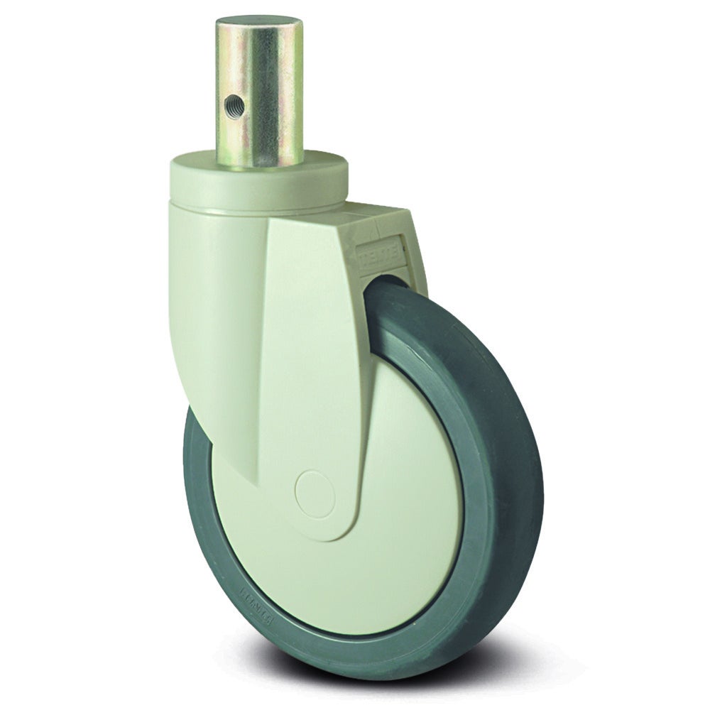 Integral万向脚轮采用实心闸杆圆形连接方式,确保稳固的安装连接。脚轮外壳由钢板,中号材质制成,配备两个钢珠滚道的旋转轴承系统,提供平稳的360度旋转性能。车轮轮体采用聚丙烯材料制造,具有优异的耐用性和轻量化特性。轮面覆盖实心橡胶,不留痕,Shore A 63硬度等级的胎面材料,适用于对地面保护要求较高的应用场合。车轮内置精密滚珠轴承,确保运行顺畅并降低滚动阻力。车轮直径为125毫米,脚轮总高度为163毫米,紧凑的尺寸设计便于在有限空间内使用。该万向脚轮的动载荷能力为80千克(测试速度3千米每小时),静载荷能力达到160千克,能够满足中等负载的移动设备需求,适用于工业推车、设备台架等多种应用场景。