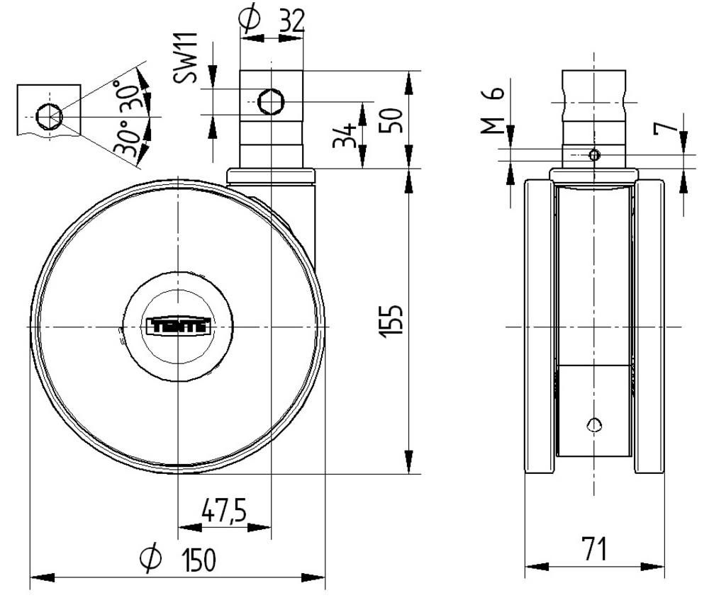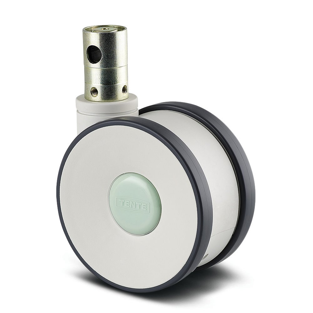 Linea clinic带中控全锁或方向锁的万向脚轮采用带凸轮孔的闸杆,用于异型杆,短版本的安装方式。脚轮外壳由聚酰胺材料制成,配备精密滚珠轴承的旋转机构,确保平稳转动。车轮本体同样采用聚酰胺材料,胎面为注塑聚氨酯材质,轮径为150毫米,轴承采用精密滚珠轴承设计。脚轮总高度为155毫米。动态载荷能力在3公里/小时速度下为150公斤,在4公里/小时速度下为150公斤,静态载荷能力达450公斤。该产品广泛应用于麻醉车、C形臂CT扫描仪核磁共振X光设备、带轮计算机、透析车、医院病床、医院设施、药品车、养老院和护理院设备、护理车、担架、超声设备以及呼吸机等医疗设备领域。