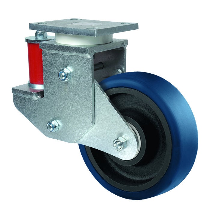 Omikron flex万向脚轮采用矩形板安装方式,具备卓越的承载性能和耐用性。脚轮外壳采用铸铁或锻铁重型材质制造,配备深槽滚珠推力滚柱轴承的旋转机构,确保平稳转向和长期可靠运行。车轮主体为铸铁材质,胎面采用铸造的Ultratech聚氨酯材料,提供优异的耐磨性和减震效果,轴承系统使用精密滚珠轴承保证运转精度。车轮直径为200毫米,脚轮总高度为272毫米,结构紧凑适用性强。动态承载能力在4公里每小时速度下可达900公斤,在6公里每小时速度下为600公斤,静态承载能力高达1800公斤。该产品专为航空航天工业机场设备和重型AGV系统等高要求应用场景设计,能够满足重载工况下的可靠运行需求。