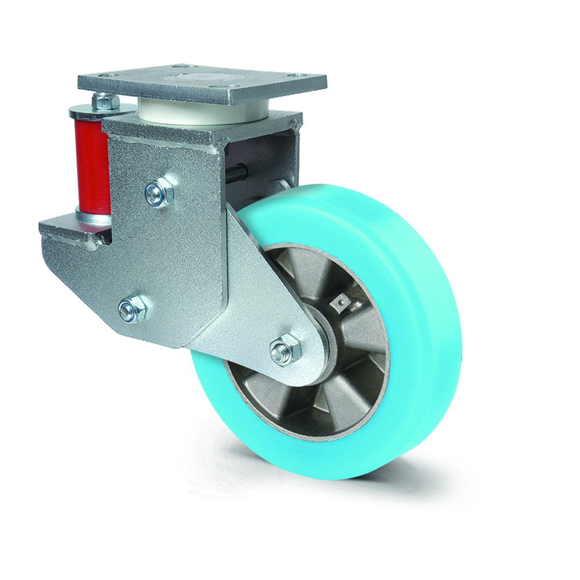 Omikron flex万向脚轮采用矩形板安装方式,配备铸铁或锻铁重型轮架和深槽滚珠推力滚柱轴承转向系统,确保卓越的承载性能和转向灵活性。车轮主体采用铝制材料,胎面为铸造Ultratech聚氨酯材质,配置精密滚珠轴承,轮径200毫米,整体高度272毫米。该脚轮静态承载能力达1400公斤,动态承载能力在4公里/小时速度下为700公斤,在6公里/小时速度下为560公斤。产品专为航空航天工业机场设备和重型AGV系统等高要求应用场景设计,能够满足工业环境中的重载运输需求。