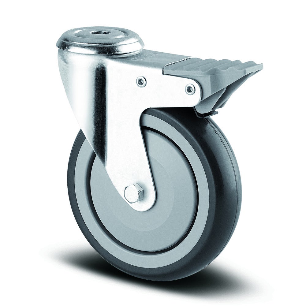 Agila smart带全锁的旋转脚轮采用螺栓孔安装方式,确保稳固连接。脚轮外壳采用钢板轻型材质制造,配备两个钢珠滚道的旋转轴承系统,提供平稳的360度旋转性能。车轮轮体由聚丙烯材料制成,踏面使用实心橡胶,不留痕,Shore A 63硬度等级,具备优异的耐磨性和地面保护特性。轮子内置精密滚珠轴承,确保运行顺畅且使用寿命长。脚轮直径为100毫米,总高度为135毫米,结构紧凑适用于各种设备。动态承载能力为70公斤(在3公里/小时速度下),静态承载能力达140公斤,能够满足重载应用需求。该脚轮特别适用于护理床、医院以及养老院和护理院等医疗保健环境,为医疗设备提供可靠的移动解决方案。