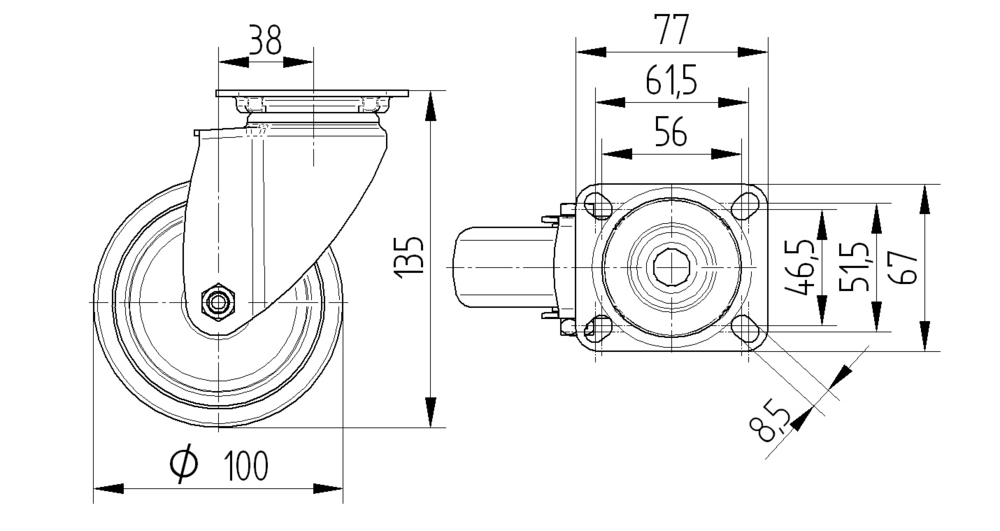 Agila stainless万向脚轮采用矩形板安装方式,提供稳定可靠的连接。脚轮外壳采用不锈钢,中号规格制造,配备两个钢珠滚道的旋转轴承系统,确保平稳转向和优异的耐腐蚀性能。车轮轮体由聚丙烯材料制成,胎面覆盖热塑性橡胶,提供良好的减震和静音效果,轮径为100毫米。轴承系统采用精密滚珠轴承,不锈钢材质,保证长期使用的可靠性和顺畅运行。脚轮总高度为135毫米,结构紧凑适用于各种应用场景。载重能力方面,动载荷为100公斤(运行速度3公里/小时),静载荷可达200公斤,满足中等强度的使用需求。该产品特别适用于餐饮手推车和送餐系统以及专业清洁车等应用领域,在食品服务和清洁维护行业中表现出色。