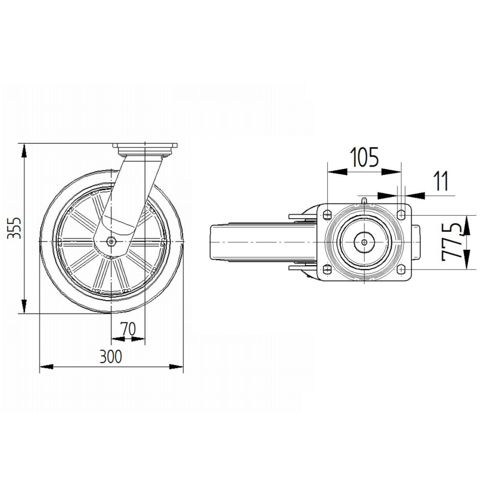 Kappa万向脚轮采用矩形板安装方式,具有卓越的承载性能和耐用性。脚轮外壳采用铸铁或锻铁重型材质制造,配备两个球座圈转向轴承,提供加强型或不锈钢型选择,确保平稳转向和长久使用寿命。车轮轮体采用铝制材质,表面覆盖黑色硫化弹性轮胎,内置精密滚珠轴承,车轮直径为300毫米。脚轮总高度为355毫米,结构紧凑合理。动态承载能力在4公里每小时速度下可达600公斤,在6公里每小时速度下可达480公斤,静态承载能力高达1200公斤。该产品广泛应用于航空航天工业机场设备、AMR系统、汽车OEM、陶瓷和玻璃制造商、生产和平台手推车以及重型AGV系统等多个工业领域,为各种重载移动设备提供可靠的移动解决方案。