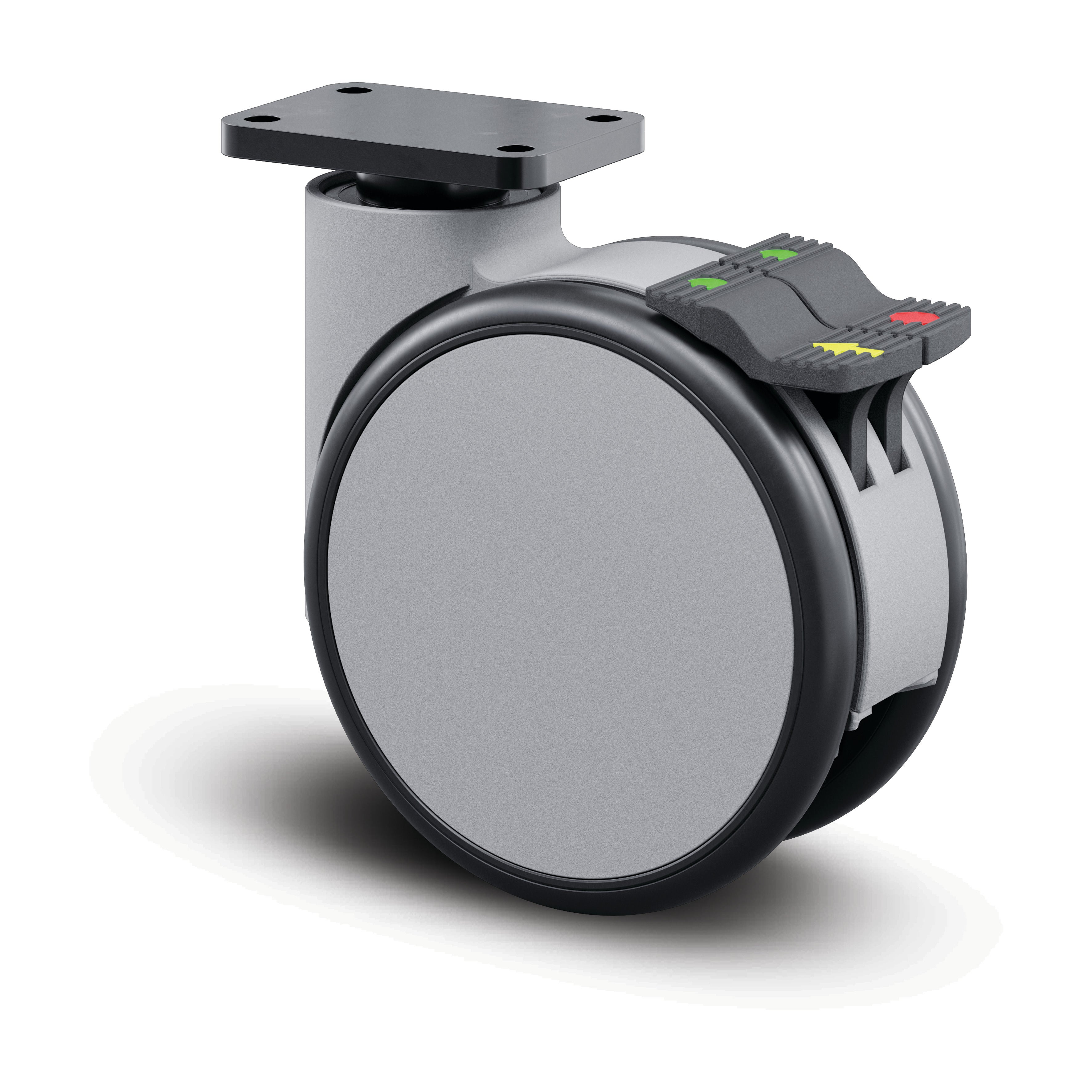 Forma带组合锁的旋转脚轮采用矩形板安装方式,为工业应用提供可靠的移动解决方案。脚轮外壳采用锌压铸/铝材质制造,确保优异的耐腐蚀性和结构强度,配备精密滚珠轴承的旋转机构保证平稳转向和长久使用寿命。车轮轮体采用聚酰胺材料制成,具有出色的机械性能和耐磨性,轮面覆盖弹性轮胎,无痕,硫化处理,有效保护地面并提供良好的减震效果,轮毂内置精密滚珠轴承确保滚动顺畅。脚轮车轮直径为150毫米,整体高度为176毫米,紧凑的设计适合各种安装环境。该脚轮动态承载能力达135千克(测试速度3千米/小时),能够满足中等负载的移动设备需求,组合锁功能提供可靠的定位控制。