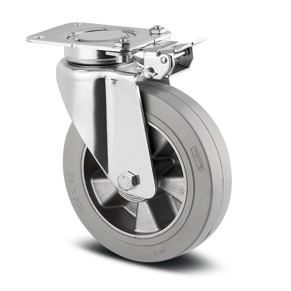 Delta带方向锁的旋转脚轮采用矩形板安装方式,为重型工业应用提供可靠的移动解决方案。脚轮外壳采用钢板重型结构,配备精密滚珠轴承旋转机构,确保平稳转向和卓越的耐用性。车轮轮体采用铝制材料,表面覆盖弹性轮胎,无痕硫化处理,有效保护地面并提供优异的滚动性能,轮子轴承同样采用精密滚珠轴承设计。车轮直径为125毫米,脚轮总高度为178毫米,结构紧凑适用于各种设备安装。动态承载能力在4公里/小时速度下可达300公斤,在6公里/小时速度下为240公斤,静态承载能力高达600公斤。该脚轮广泛应用于航空航天工业机场设备、汽车OEM、邮政物流系统、生产和平台手推车以及运输设备等领域,满足高强度工业环境的严苛要求。