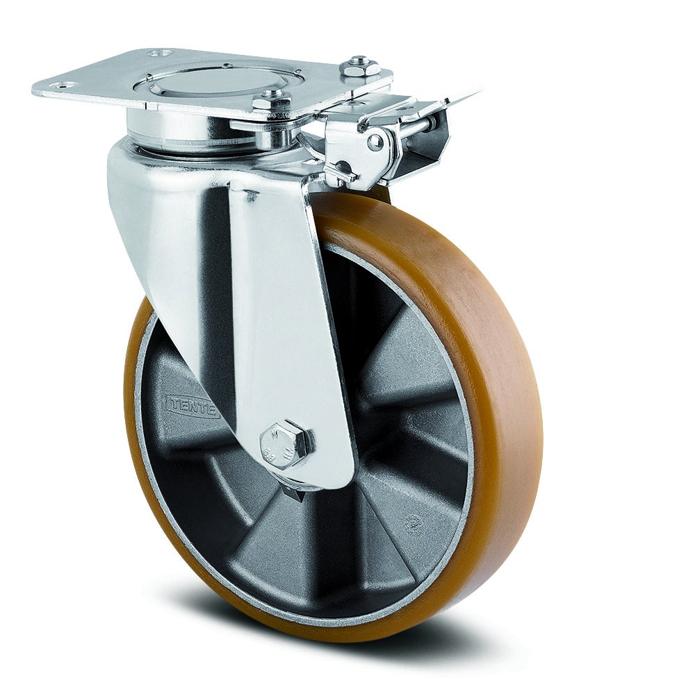 Delta带方向锁的旋转脚轮采用矩形板安装方式,为重型工业应用提供可靠的移动解决方案。脚轮外壳采用钢板重型结构,配备精密滚珠轴承旋转机构,确保平稳转向和卓越的耐用性。车轮本体采用铝制材料,胎面为铸造聚氨酯材质,轮径125毫米,轮轴配置精密滚珠轴承系统,保证运行的平顺性和长久使用寿命。脚轮总高度为178毫米,结构紧凑适用于各种设备安装需求。动态承载能力在4公里/小时速度下可达500公斤,在6公里/小时速度下为400公斤,静态承载能力高达1000公斤,满足重载应用要求。该产品广泛应用于航空航天工业机场设备、汽车OEM、邮政物流系统、生产和平台手推车以及运输设备等领域,为各种工业移动设备提供专业级的承载和移动性能。