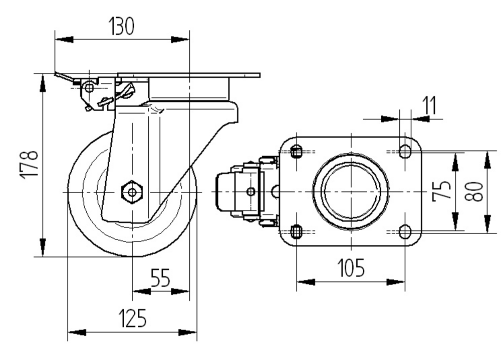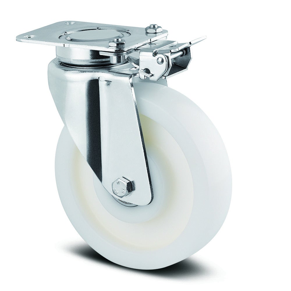 Delta带方向锁的旋转脚轮采用矩形板安装方式,为重型工业应用提供可靠的移动解决方案。脚轮外壳采用钢板重型结构,配备精密滚珠轴承旋转机构,确保平稳转向和出色的耐久性。车轮本体采用聚酯胺重型材料制造,胎面材料与轮子体相同,保证一致的性能表现,轮毂内置精密滚珠轴承,车轮直径为125毫米。脚轮总高度为178毫米,结构紧凑适合各种安装环境。动态承载能力在4公里/小时速度下可达600公斤,在6公里/小时速度下可达480公斤,静态承载能力高达1200公斤。该产品广泛应用于航空航天工业机场设备、汽车OEM、邮政物流系统、生产和平台手推车以及运输设备等领域,满足重载移动设备的严苛要求。