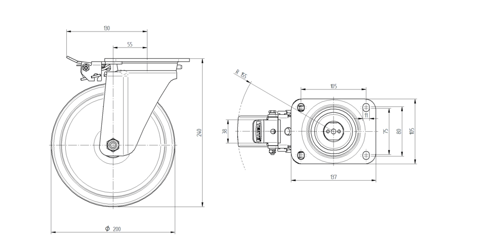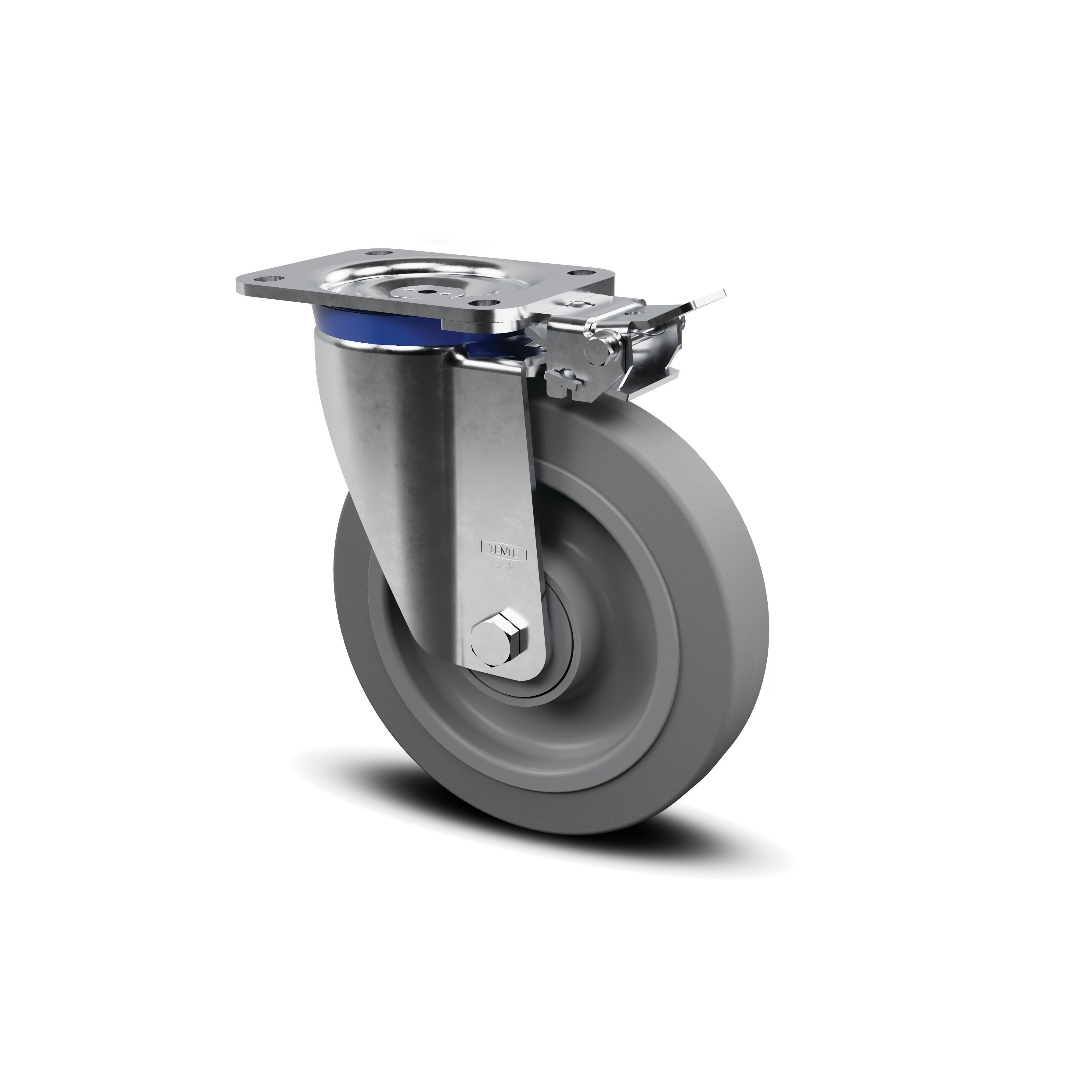 Zeta stainless带方向锁的旋转脚轮采用矩形板安装方式,配备不锈钢重型外壳,具有两个钢珠滚道的旋转轴承结构,确保卓越的转向性能和耐久性。脚轮采用聚氨酯轮体,配备弹性轮胎、无痕、硫化胎面材料,提供优异的地面保护性能和静音运行效果。轮子装配精密滚珠轴承,密封的设计有效防止污染物侵入,延长使用寿命。产品轮径为200毫米,总高度为240毫米,结构紧凑适用于各种工业应用场景。动态载荷能力在4公里每小时速度下可承载400公斤,在6公里每小时速度下可承载320公斤,静态载荷能力高达800公斤,能够满足重载设备的移动需求,为工业运输提供可靠的承载解决方案。