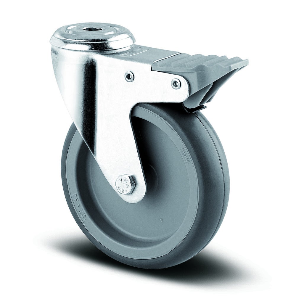 Agila smart带全锁的旋转脚轮采用螺栓孔安装方式,确保稳固连接。脚轮外壳采用钢板轻型材质制造,配备两个钢珠滚道的旋转轴承系统,提供平稳灵活的转向性能。车轮主体由聚丙烯材料构成,胎面覆盖热塑性橡胶,具备优异的耐磨性和静音效果,内置滑动轴承确保运行顺畅。车轮直径为100毫米,脚轮总高度为135毫米,结构紧凑适用于各种设备。该脚轮动载荷能力为80公斤(运行速度3公里/小时),静载荷能力达160公斤,能够承受较大重量。产品专为护理床、医院、养老院和护理院等医疗护理环境设计,满足医疗设备对移动性、稳定性和静音性的严格要求。