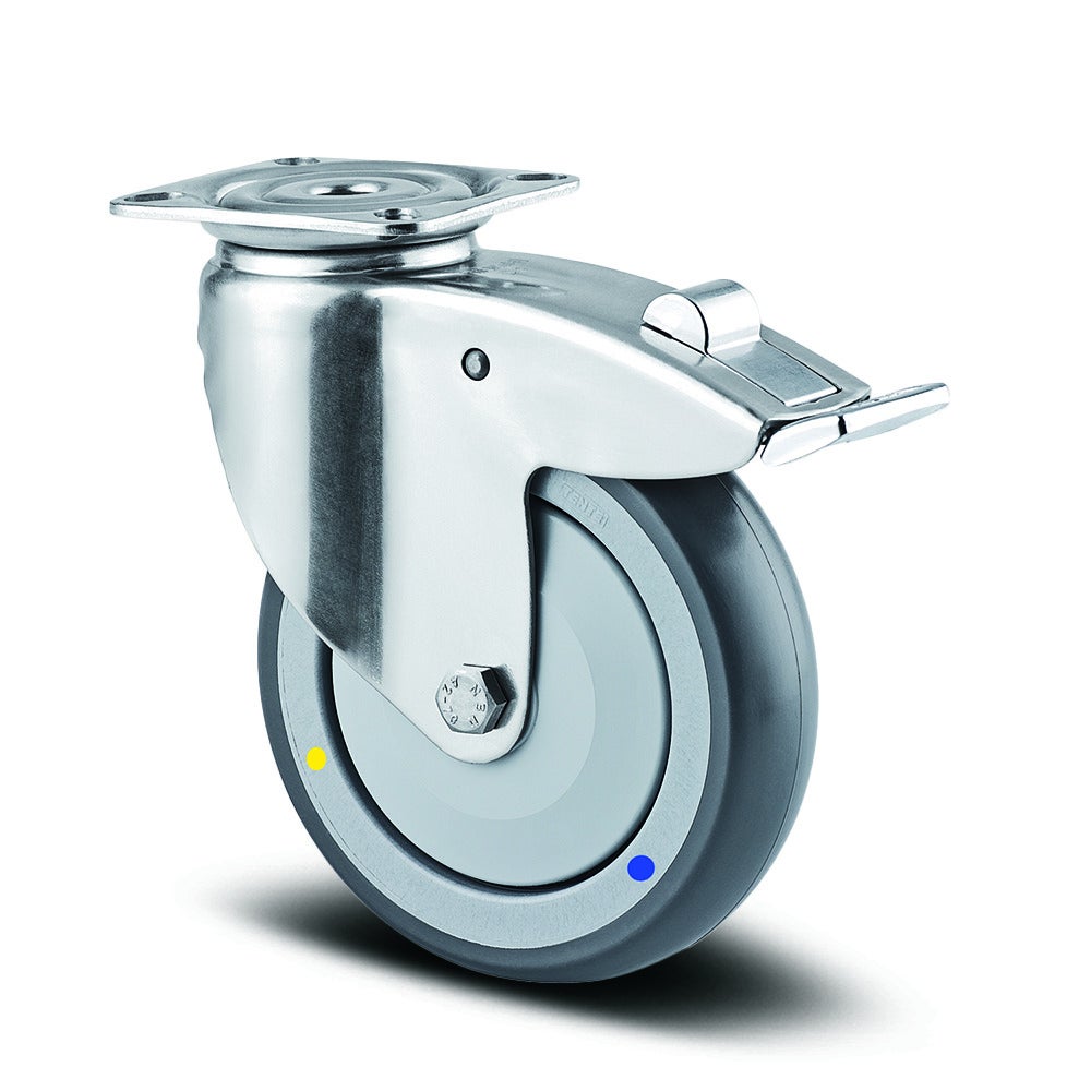 Agila stainless带全锁的旋转脚轮采用矩形板安装方式,为专业移动设备提供可靠的支撑解决方案。脚轮外壳采用中号不锈钢材质制造,配备两个钢珠滚道的旋转轴承系统,确保smooth rotation and durability。轮子主体由导电聚酯胺材料构成,胎面采用注塑导电聚氨酯材料,提供优异的耐磨性和防静电性能,轮子内置精密滚珠轴承,采用不锈钢材质制造。轮子直径为100毫米,脚轮总高度为135毫米,结构紧凑适用于各种空间限制环境。动态承载能力在3公里每小时速度下可达100公斤,静态承载能力高达200公斤,能够满足重载应用需求。该脚轮特别适用于餐饮手推车和送餐系统以及专业清洁车等对卫生要求较高的商业环境,其不锈钢结构和导电特性确保了产品在食品加工和医疗环境中的安全可靠运行。