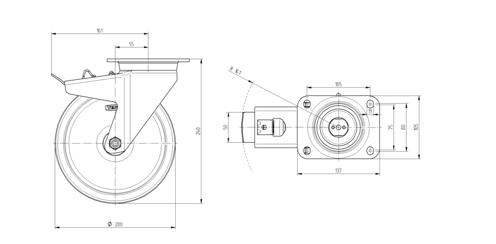 Zeta stainless带全锁的旋转脚轮采用矩形板安装方式,为重型工业应用提供可靠的移动解决方案。脚轮外壳采用不锈钢,重型设计,配备两个钢珠滚道的旋转轴承系统,确保平稳的360度旋转性能和卓越的耐久性。车轮轮体采用聚氨酯材料制造,具有优异的耐磨性和化学稳定性,轮面覆盖弹性轮胎,无痕,硫化处理,有效保护地面并提供良好的减震效果。车轮内置精密滚珠轴承,密封的设计有效防止灰尘和污染物侵入,保证长期稳定运行。车轮直径为200毫米,脚轮总高度为240毫米,结构紧凑适用于各种安装环境。动态承载能力在4公里每小时速度下可达400公斤,在6公里每小时速度下可达320公斤,静态承载能力高达800公斤,满足重载应用需求。